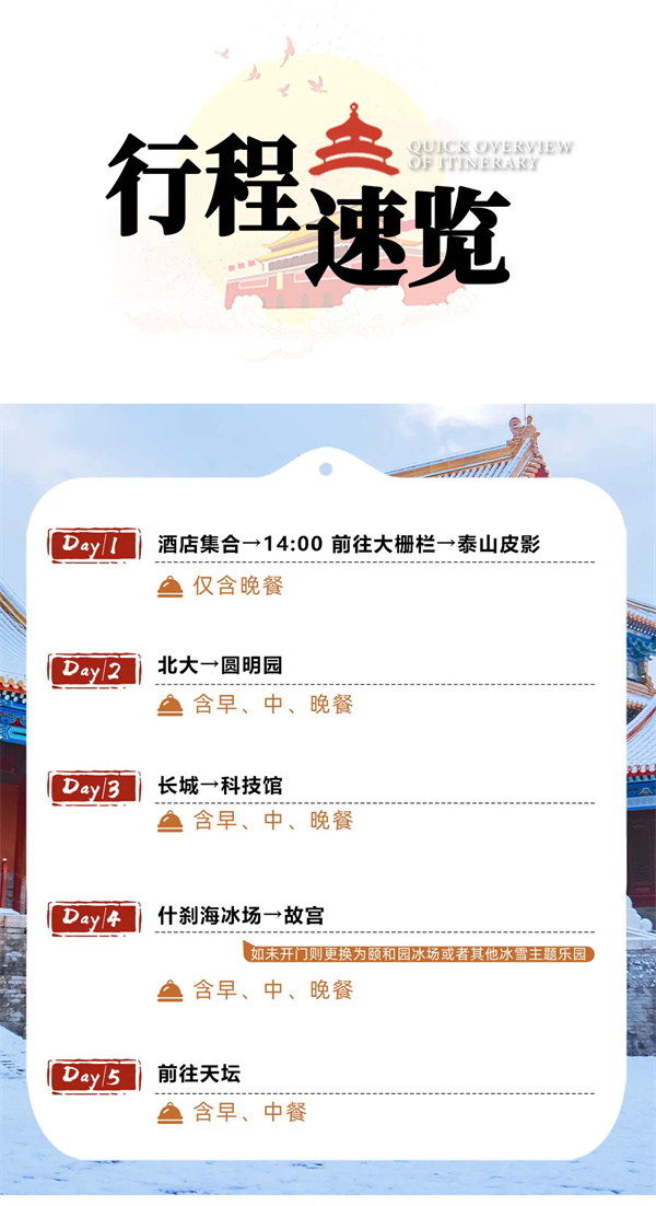 2.用餐:全程5早8正餐,餐标50元/人(包含1顿全聚德烤鸭特色餐;1顿老北京火锅特色餐)