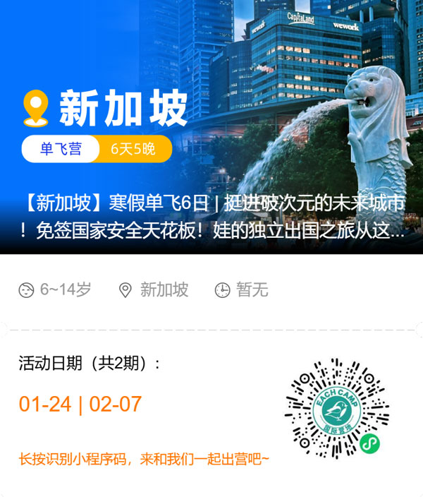我们将全程入住新加坡星级酒店,2人一间(如有男女单房差,可能会出现个别3人间/家庭房),设施完善,独立卫浴,全程连住,无需中途更换酒店,让孩子体验更舒适的住宿环境。