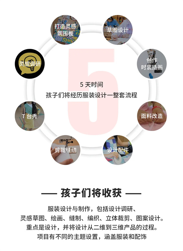 本次国庆服装设计营为期5天,面向7-14岁孩子,大家将在毕业于法国巴黎时装学院的Ms.塔飞老师指导下,在PBL法贯穿下,完成一个完整的服装艺术设计项目!