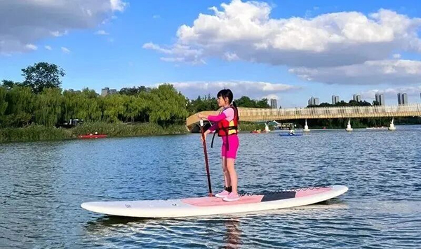 ① 孩子们将学习和体验桨板运动。桨板也被称为站立桨冲浪,起源于美国夏威夷,是近年来风靡全球的水上休闲运动。可锻炼平衡能力及协调能力,是一种健康的有氧运动,老少皆宜,适合初学者的水上运动。