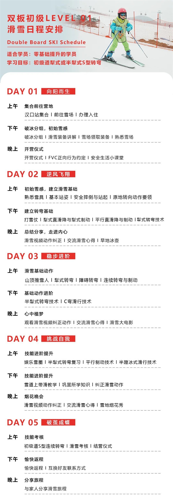 对不同技术需求的孩子进行系统授课,精准教学,高效掌握滑雪技能,专业学习考核。让每个孩子都能享受滑雪的乐趣。