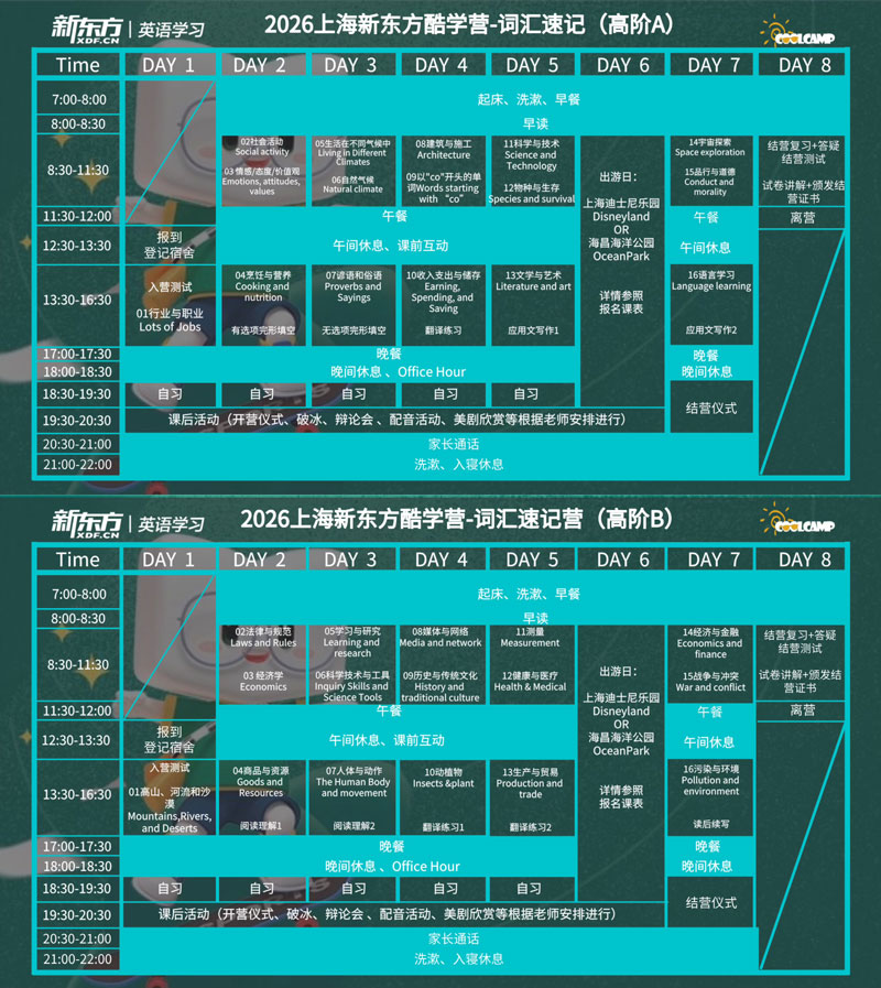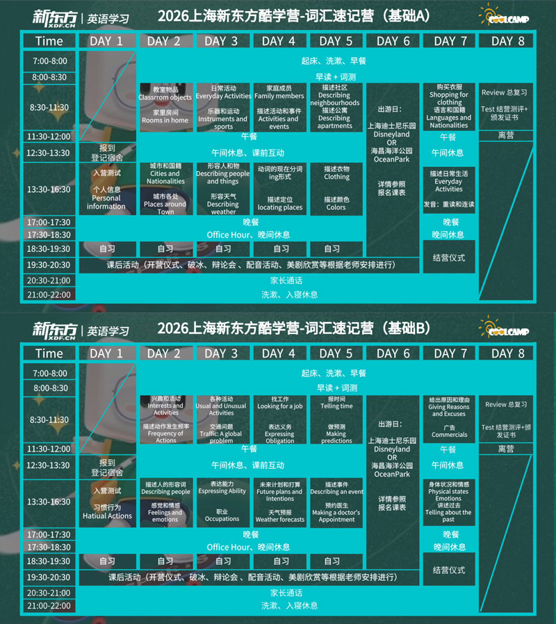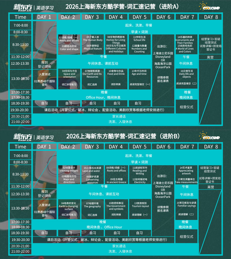 学员第一天中午12点入营,第八天11点半离营,每天上午和下午各有三个小时的学习时间,中午午饭后有午休时间,晚上还会有一个小时的自习时间,每天晚上还会有各项英语相关活动丰富孩子的晚间日常。