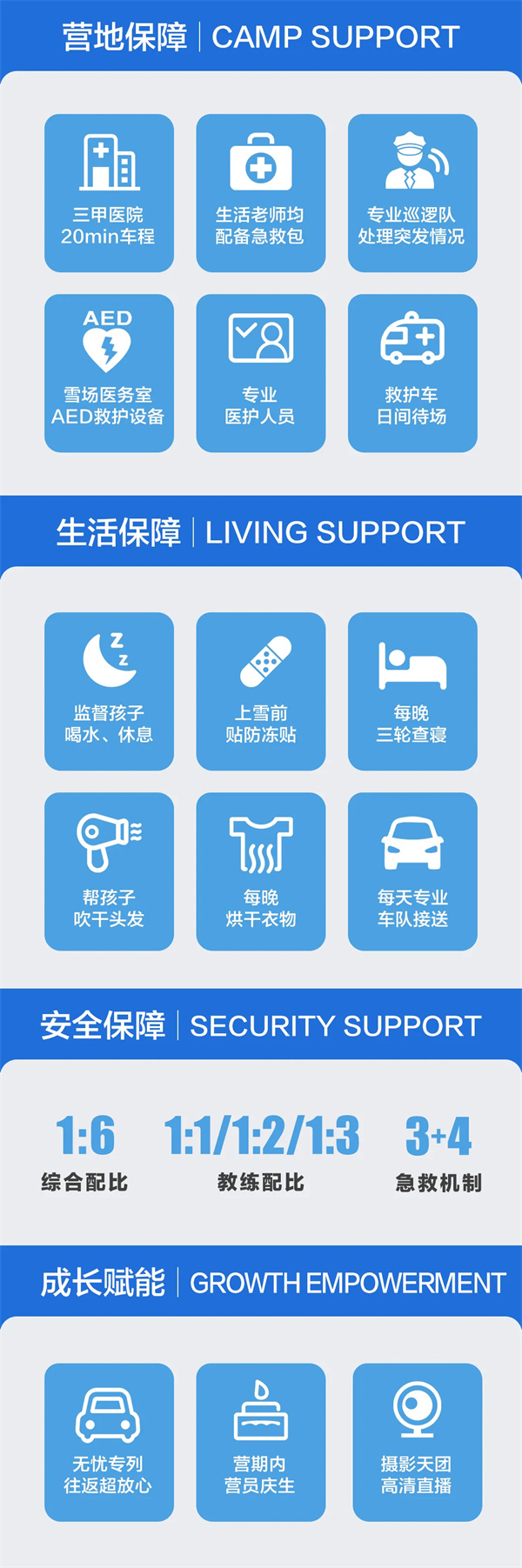 教练员每日上雪训练期间,全程安全看护陪伴和滑雪技能保障。